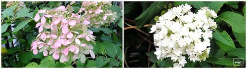 左はミナズキ。(ノリウツギ) 早くに咲いたのです。 少しずつ赤みを帯びてきました。右はヘイズ スターバースト。(ノリウツギ) 今頃になってまた咲き始めました。 私のカメラでは平面的にしか撮れないのです。 (もっと工夫すればよいのかもしれませんカ…