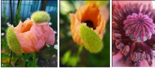 オリエンタルポピーの 帽子?? 今朝、庭に出てオリエンタルポピーを見ると、次の蕾が咲いていました。蕾を保護している苞?を花弁の先にのせているではありませんか?もう何年も育てていますが、初めて見ました。 右は蕊。極薄の和紙のような繊細な花弁と違…