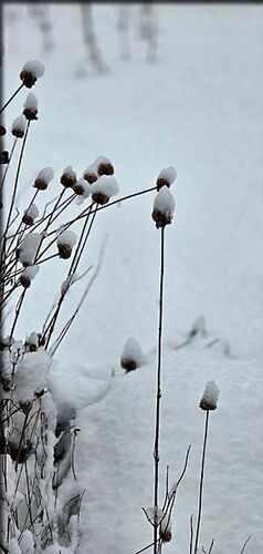 モナルダ 雪に覆われた庭。 春にはきれいな花を見せてくれた モナルダ。 庭にあるのは ピンク・ラベンダー・白・パープルの4色。 花後は ↓ こんな感じです。 茶色に変身したモナルダが雪の帽子をかぶりました。 時折小雪が舞う庭でたたずんでいます。
