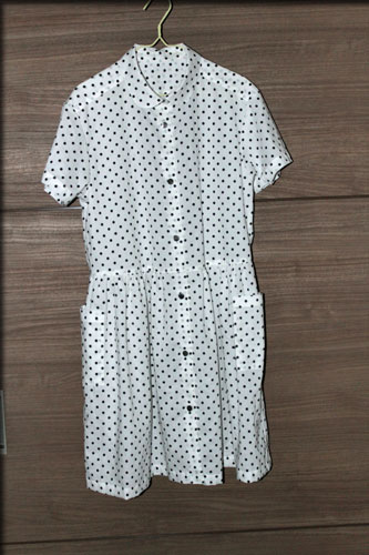 一昨日届いた布を水に通し、今朝アイロンをかけ、Rのシャツワンピースを作りました。白地に黒のドット柄。