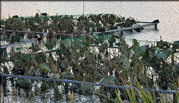 以前は一面、蓮の花が咲いていたそうですが、アカミミガメの食害でほんの一部分に残るだけです。